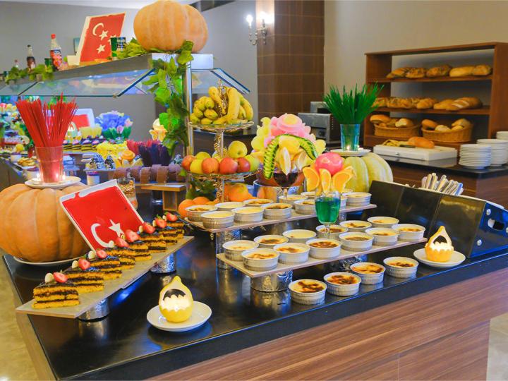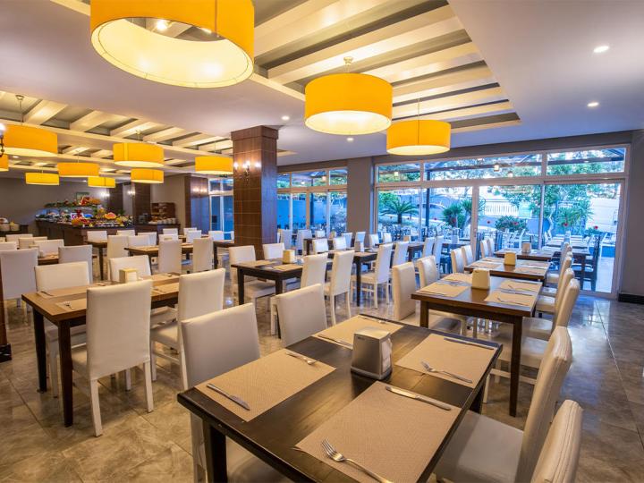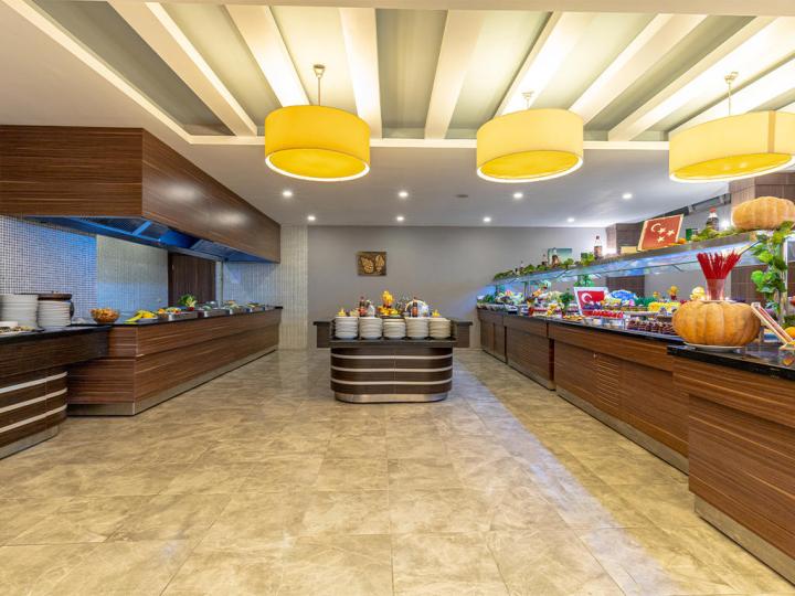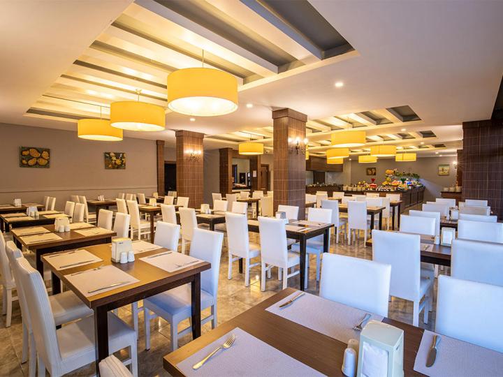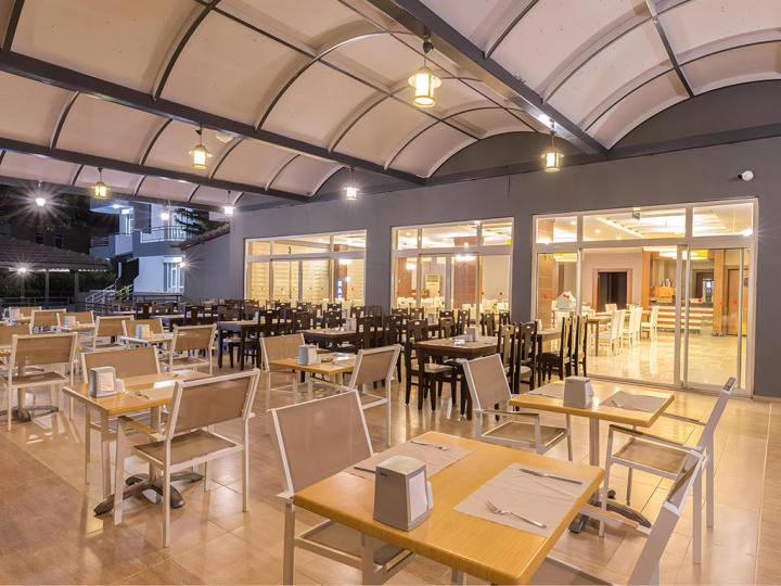 Glavni restoran na bazi otvorenog bufe-a, barovi kod bazena i lobi bar.
