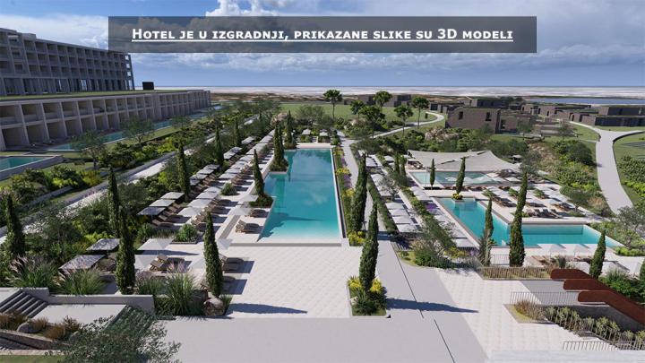 Hotel raspolaže sa sopstvenom, privatnom peščano-šljunkovitom plažom dužine 1040 metara koja je podeljena na 3 dela – 200 metara plaže samo za porodice, 80 metara plaže samo za odrasle goste i 100 metara plaže za sve tipove gostiju. Ležaljke i suncobrani su besplatni za goste hotela, dok se kabane na plaži mogu dobiti uz doplatu. Peškiri za plažu su takođe besplatni za goste hotela.